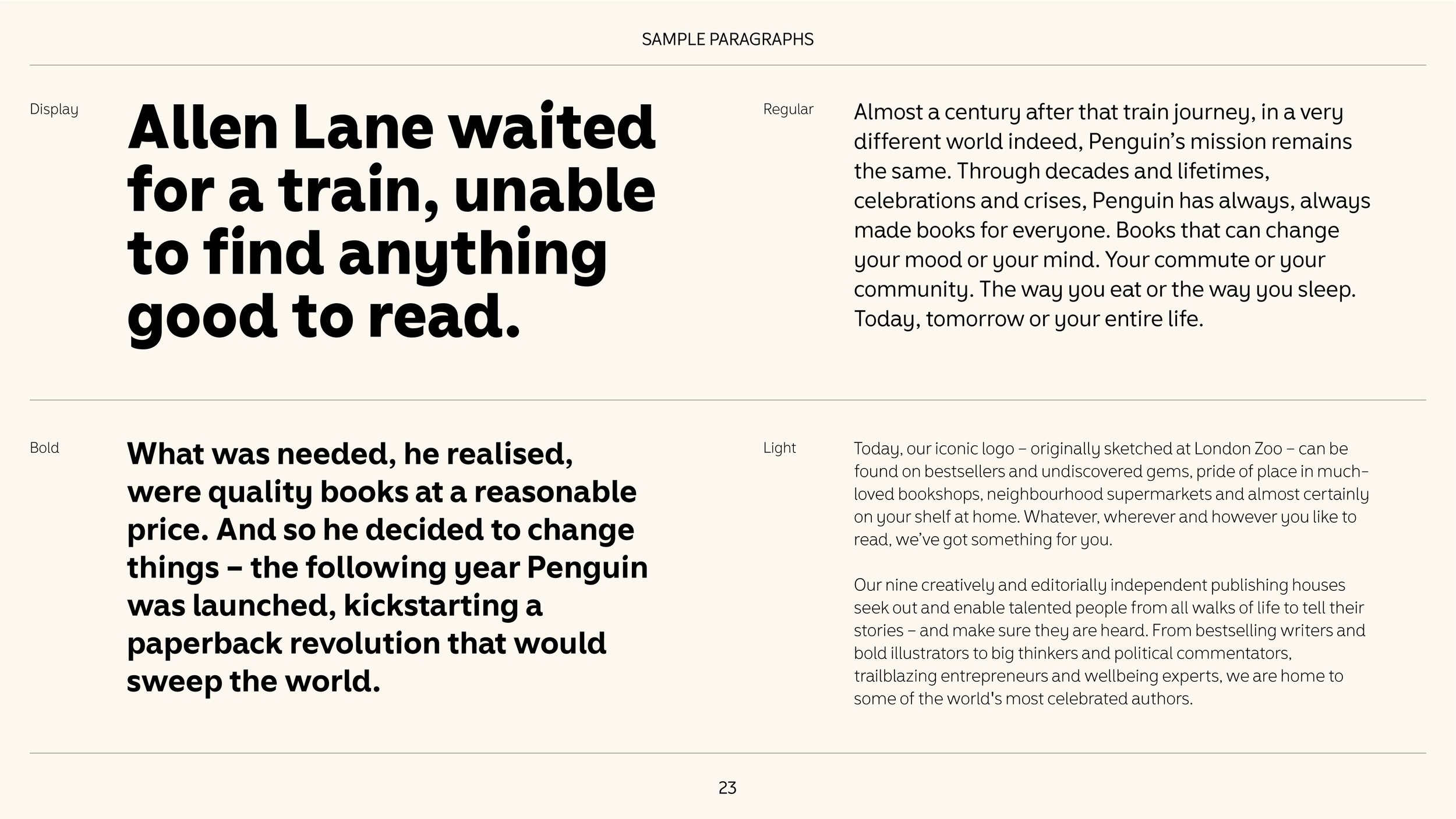 For 90 years, Penguin has been committed to making books for everyone. Its iconic sixpenny paperbacks revolutionised access to stories and knowledge, making reading more inclusive and affordable. Staying true to this spirit of inclusion, Penguin commissioned a custom version of Inclusive Sans - an accessible typeface - to serve as its primary brand font across its global publishing house.